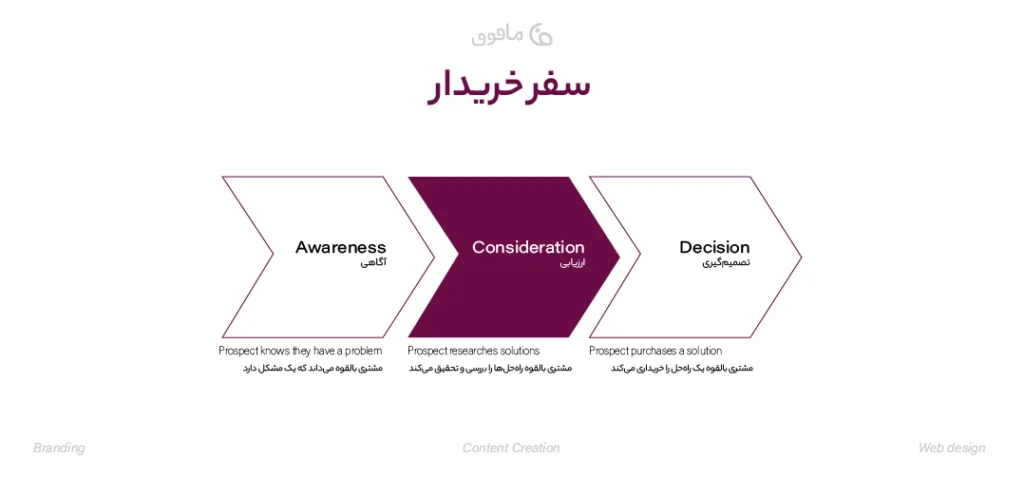 در مرحله بررسی، مخاطب گزینهها را مقایسه میکند. اینجا برند باید شفاف، قابل اعتماد و قابل مقایسه باشد. محتوای آموزشی، تجربه کاربری، لحن ارتباطی و حتی نحوه پاسخگویی تیم فروش، همگی در این مرحله وزن دارند.