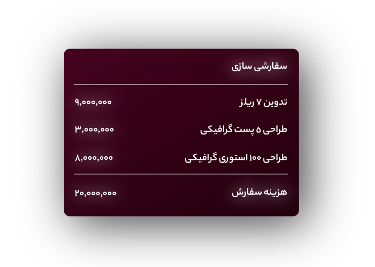 امکان سفارش پکیجهای تولید محتوا و خدمات دیجیتال مافوق بهصورت کاملاً متناسب با نیاز، اهداف و حوزه کاری کسبوکار شما فراهم است.